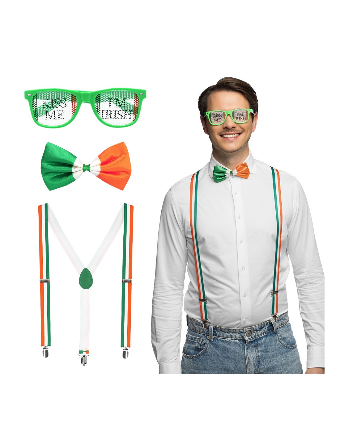 Ce kit se compose de lunettes en plastique, d'un noeud papillon Irlandais, ainsi que d'une paire de bretelle aux couleurs du drapeau Irlandais.